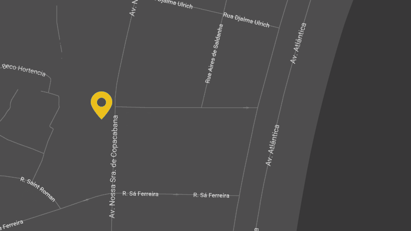 O local está a uma quadra da praia, entre as ruas Sá Ferreira e Djalma Urich, com fácil acesso a linhas de ônibus com destinos para toda a cidade, além de metro próximo.